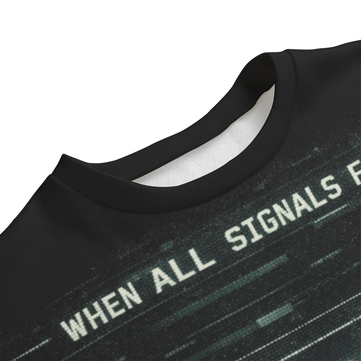 Featuring a sleek black design with digital soundwave, radar, glitch effects, and glowing text, the sweatshirt carries a powerful message: “When all signals fail… Faith Remains. I Am With You – God”